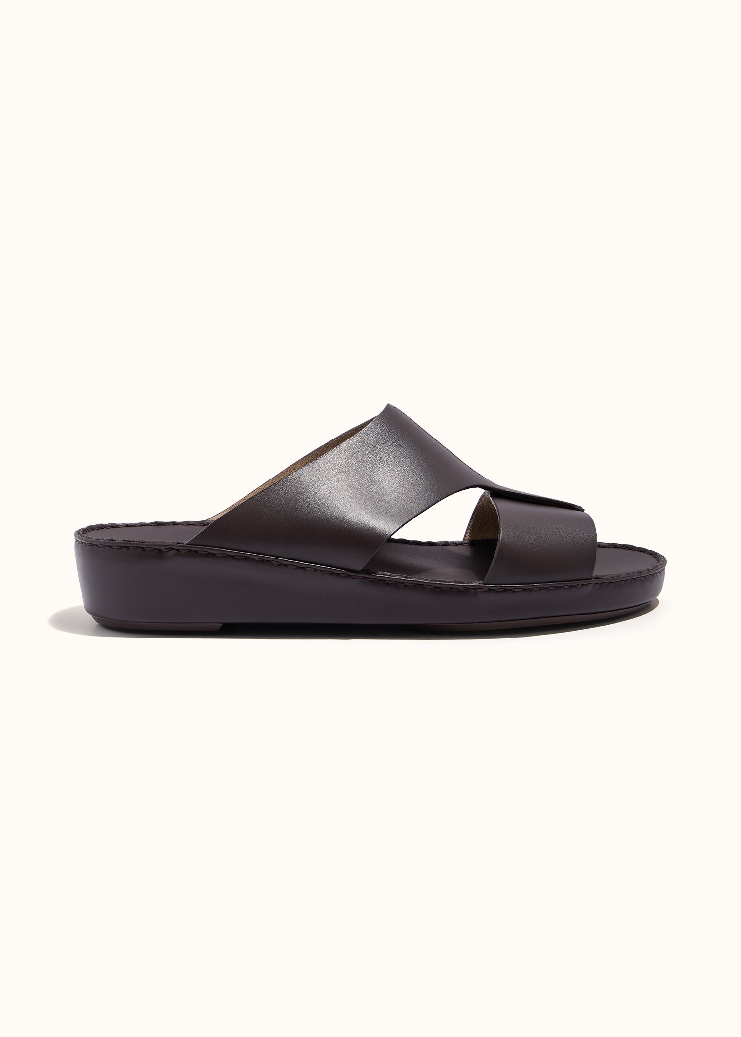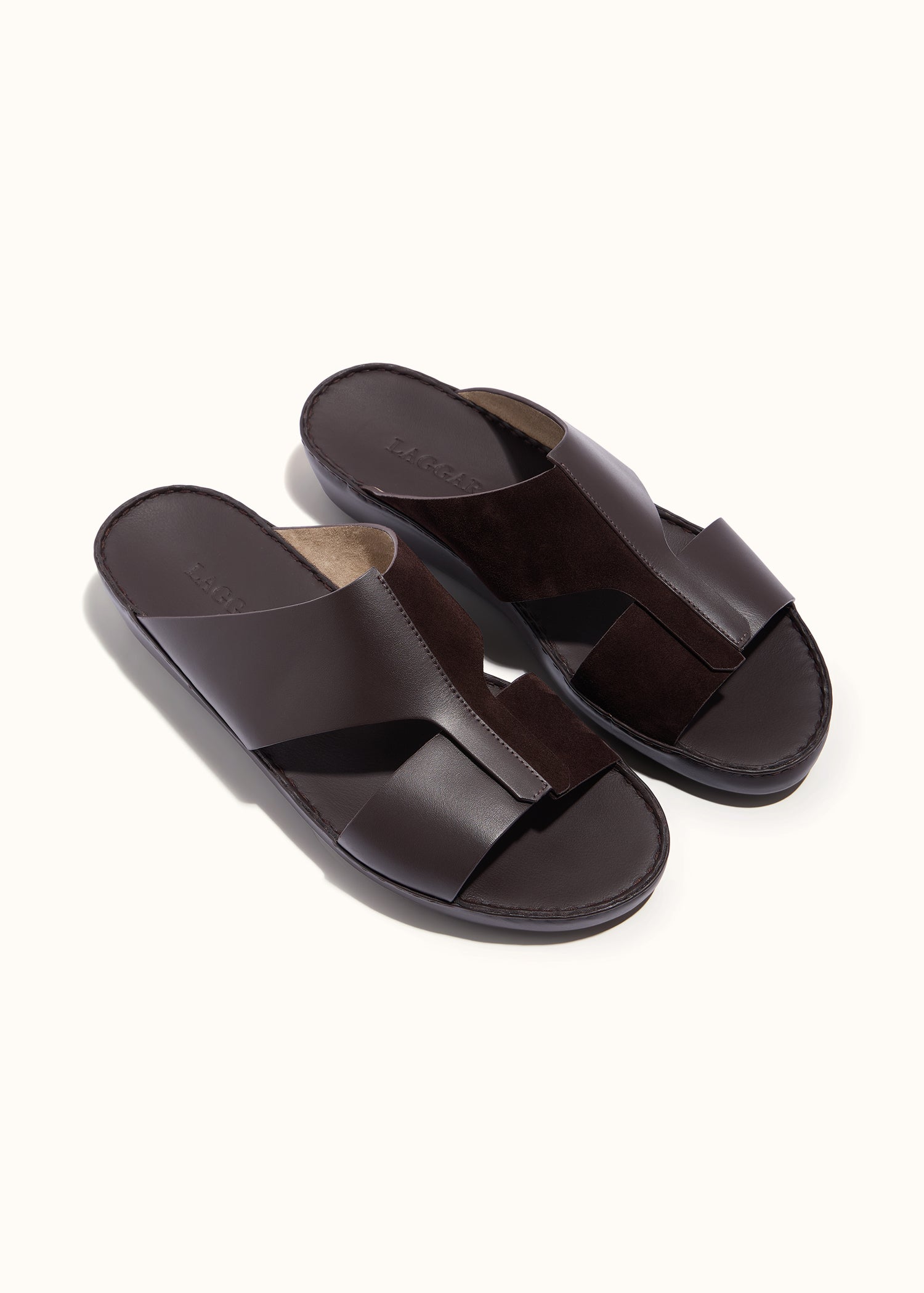 A signature LAGGAR design, the Drifted Belt Sandal redefines classic craftsmanship with a dynamic edge. Featuring a distinctive drift effect, it seamlessly blends PureCalf leather in Cacao with suede in Dark Brown, refined harmony of tones. The belt-shaped silhouette adds structure, while its fluid design evokes effortless movement and modern sophistication.