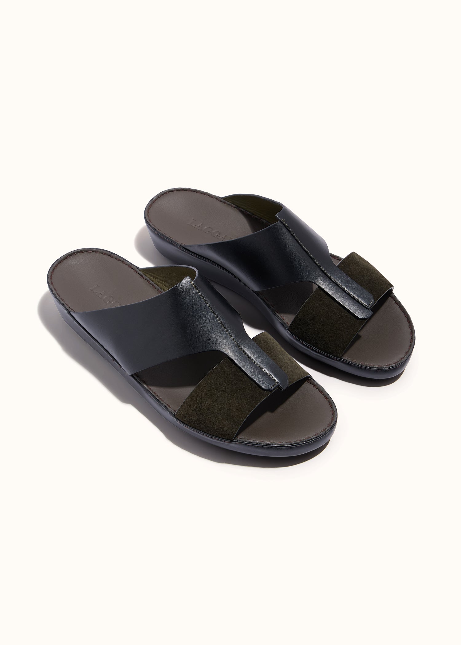 A signature LAGGAR design, the Drifted Belt Sandal redefines classic craftsmanship with a dynamic edge. Featuring a distinctive drift effect, it seamlessly blends smooth PureCalf leather in Black with rich suede in Forest Green, creating a striking contrast of textures. The belt-shaped silhouette adds structure, while its fluid design evokes effortless movement and modern sophistication.