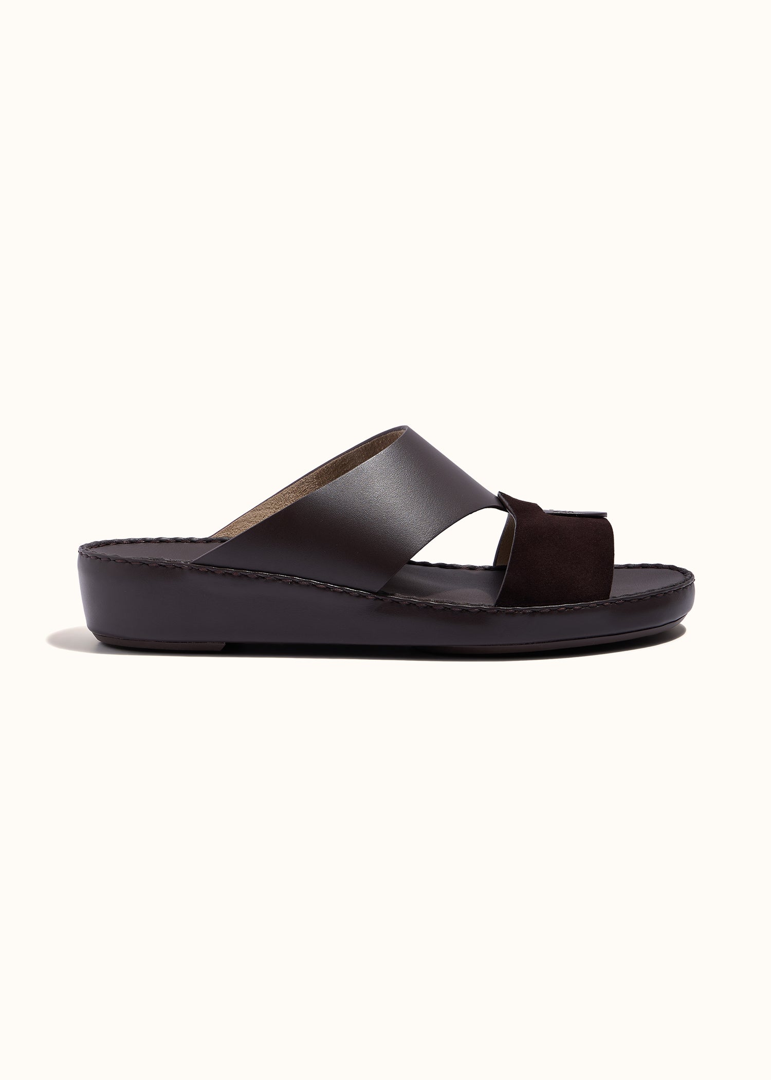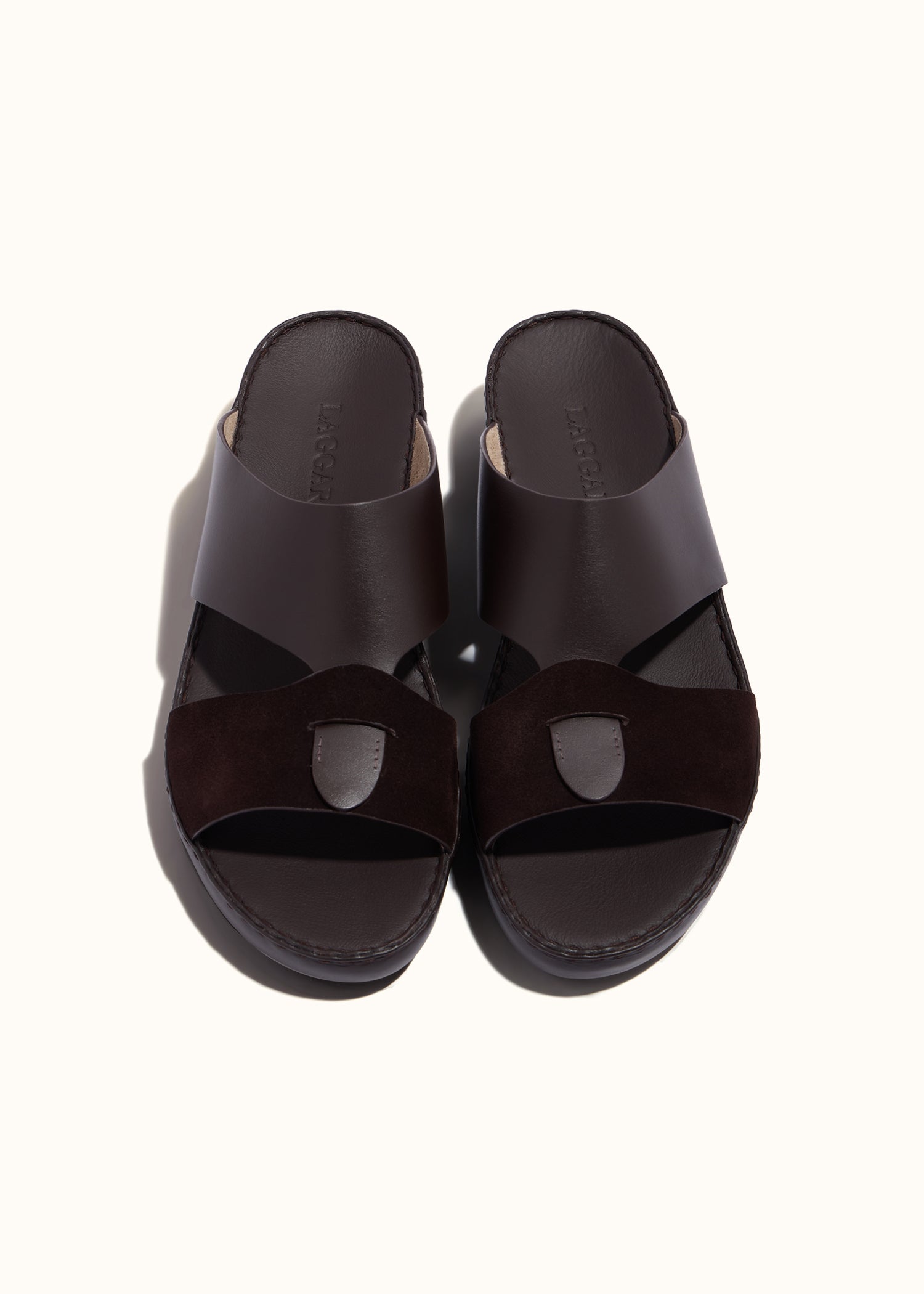 Inspired by the envelope cut, the Envelope Belt Sandal in Cacao redefines modern elegance through its distinctive form and minimal stitch detailing. Expertly crafted from a refined mix of LAGGAR PureCalf leather and Suede, it offers a sophisticated contrast in texture and tone. Designed for those who appreciate subtle uniqueness and contemporary design.