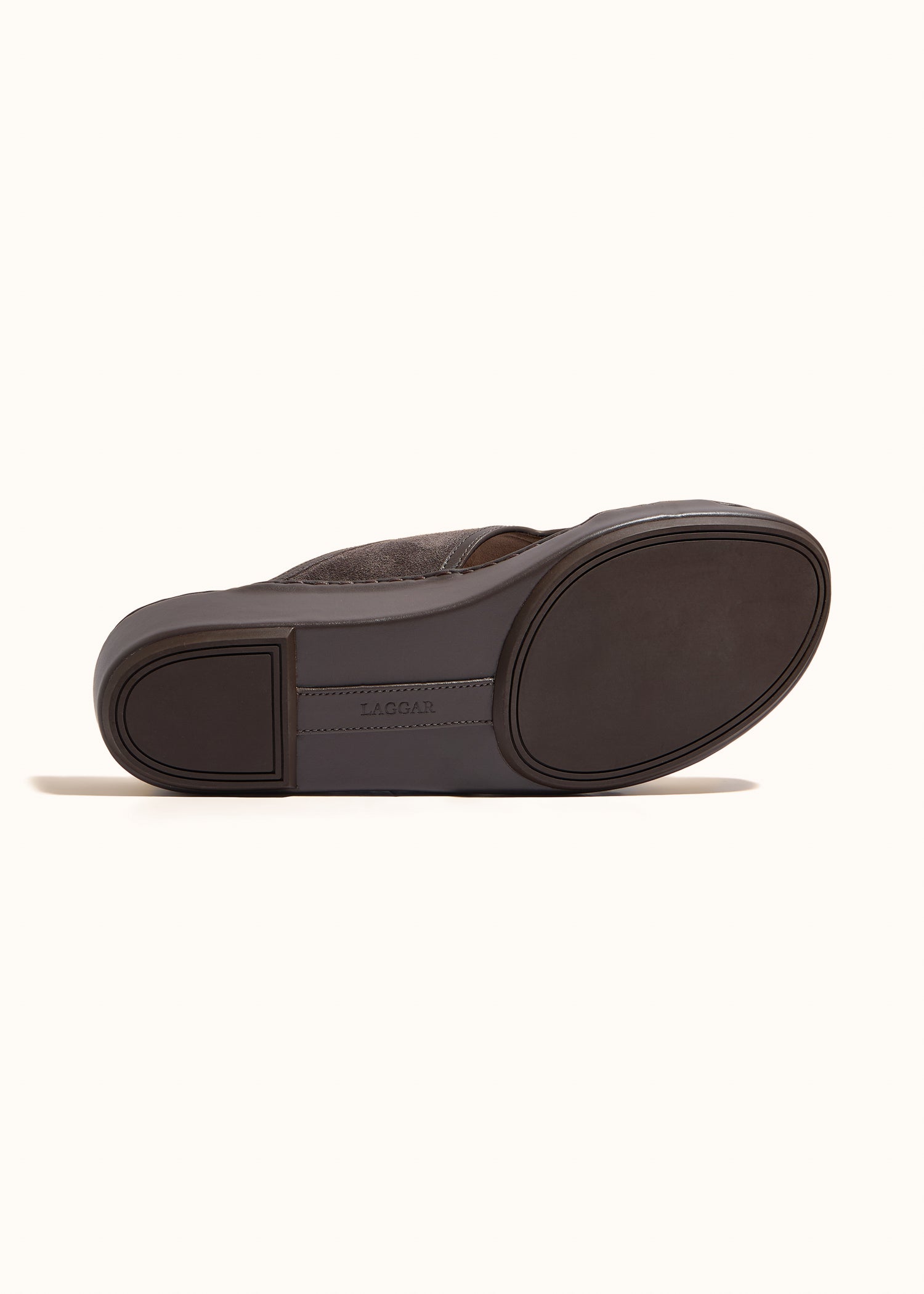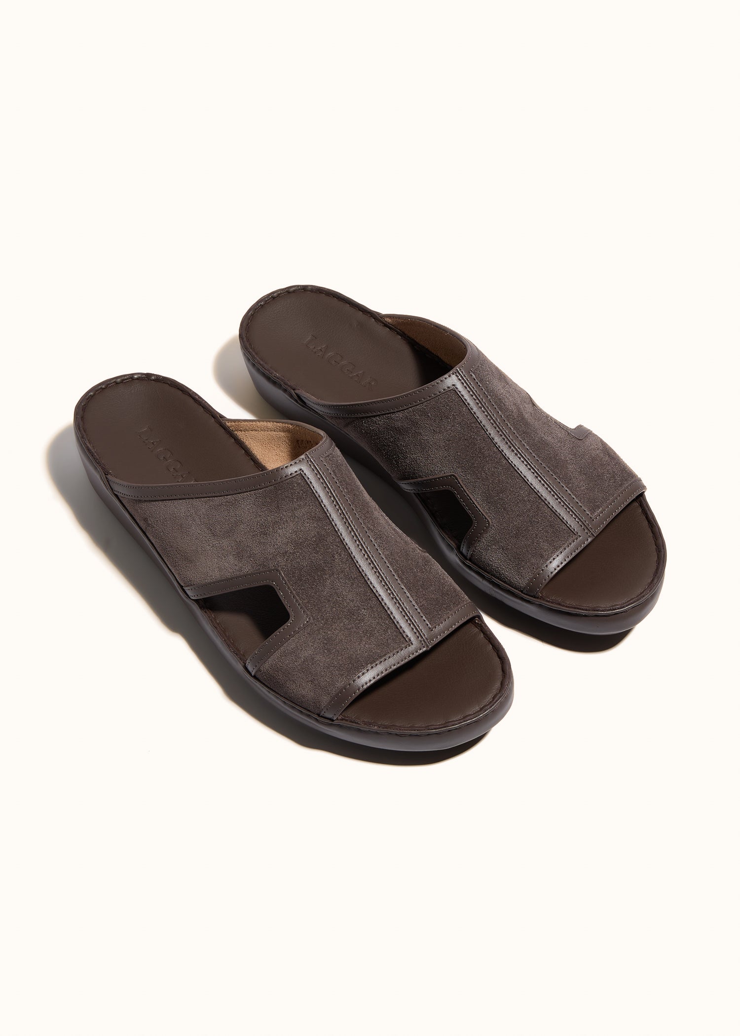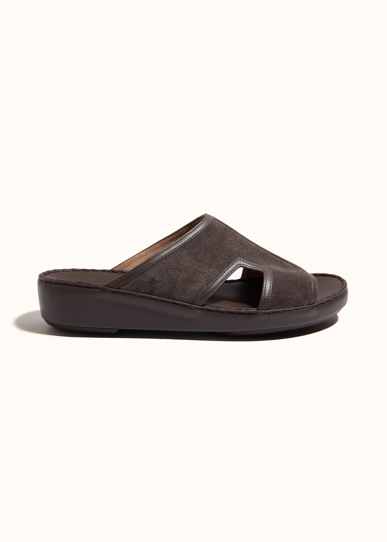 A bold expression of contemporary design, crafted with precision and sophistication. Its distinct leather-framed border, accentuated by fine stitching, creates a structured yet refined silhouette. Minimal in design but bold in presence, this sandal embodies modern luxury where craftsmanship meets effortless style.