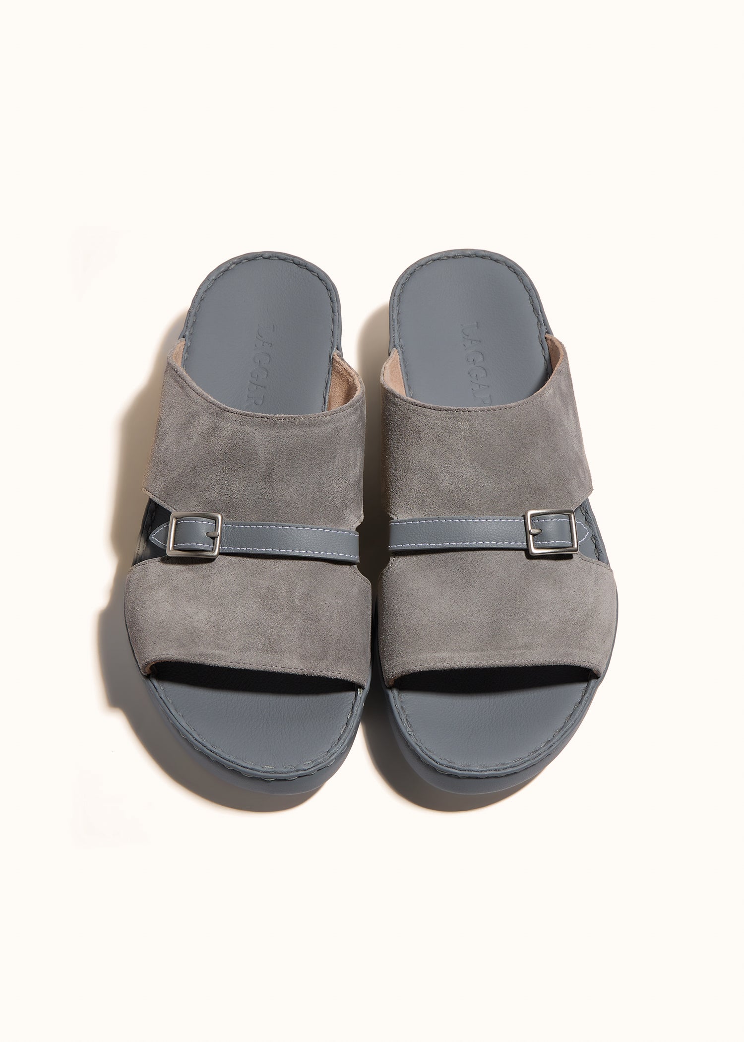 A renowned LAGGAR design, the Link Strap Sandal exudes elegance with its signature center strap and refined buckle. Crafted from suede and Purecalf leather, the sandal features contrasting stitching that adds depth to its sophisticated look. Designed for those who appreciate subtle luxury.