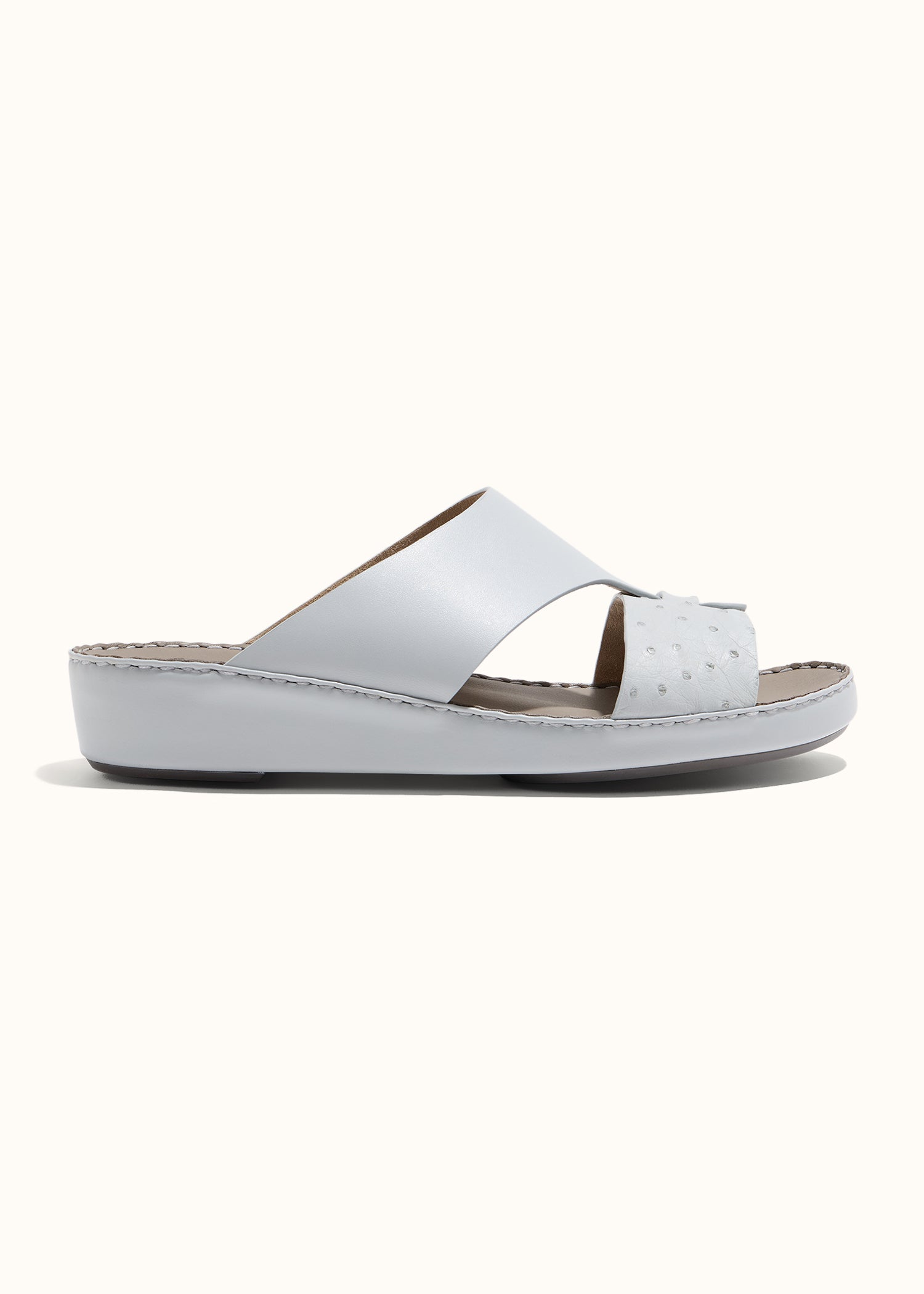 A refined contrast of PureCalf leather and Ostrich skin, the Looped Belt Sandal embodies understated elegance. With its minimalist design and timeless appeal, it seamlessly transitions from formal to everyday wear, making it a versatile essential for any occasion.