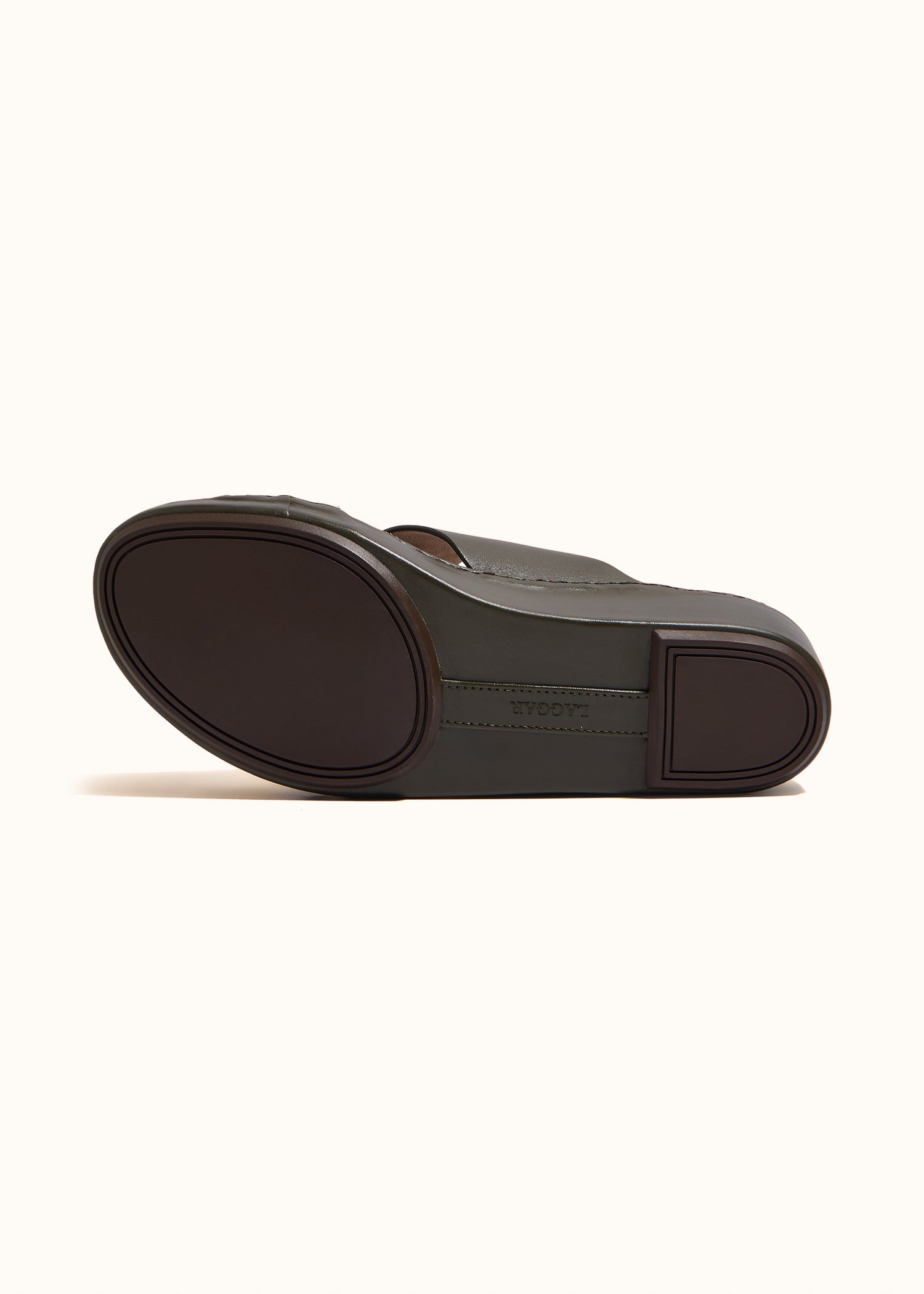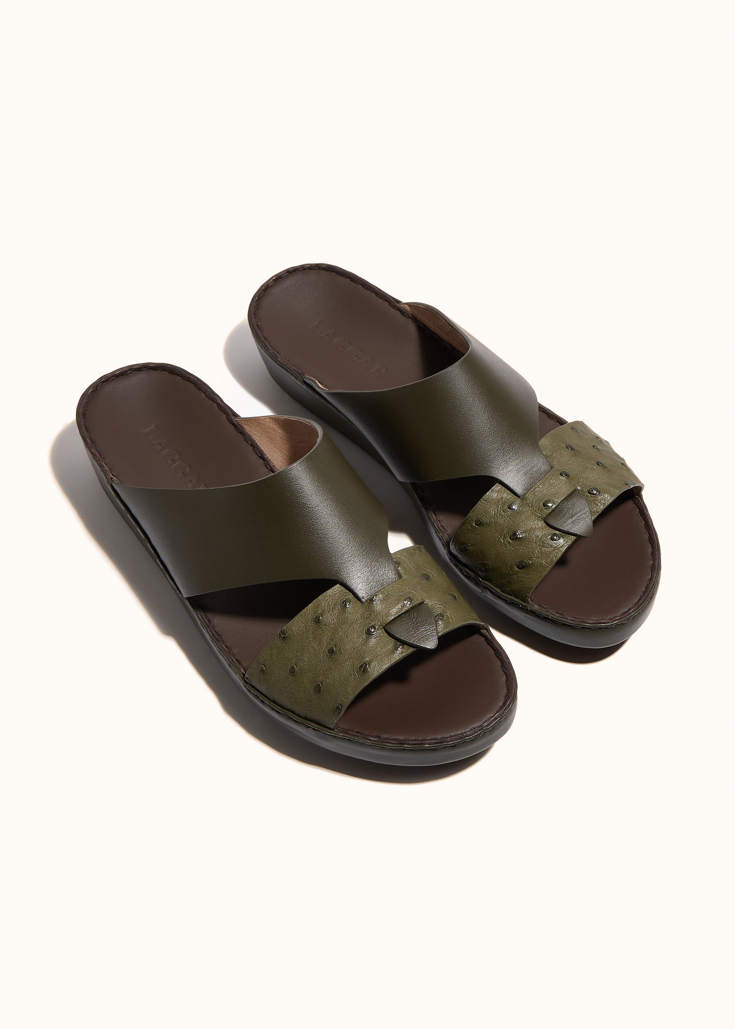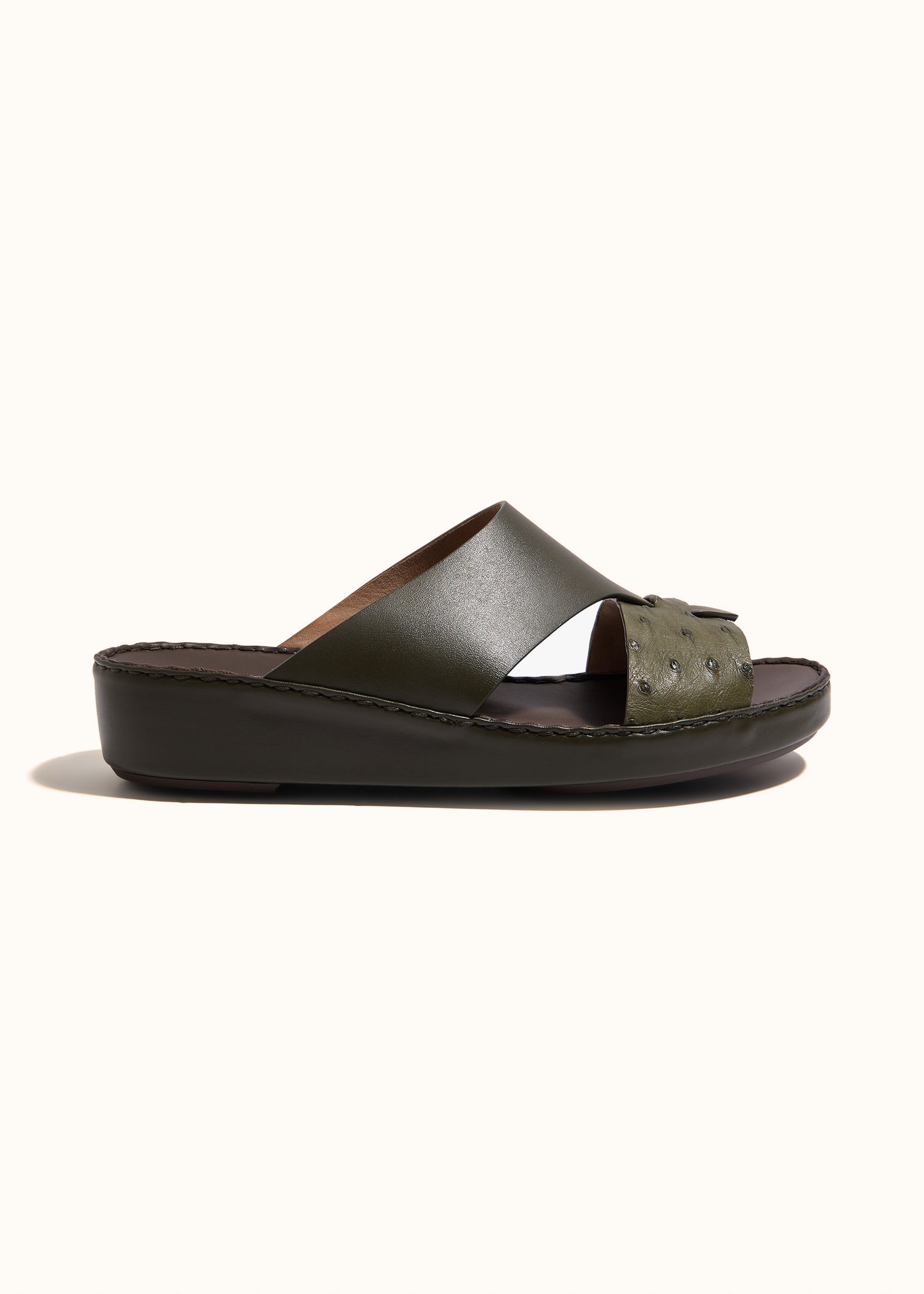 A refined contrast of Purecalf leather and Ostrich, the Looped Belt Sandal embodies understated elegance. With its minimalist design and timeless appeal, it seamlessly transitions from formal to everyday wear, making it a versatile essential for any occasion.