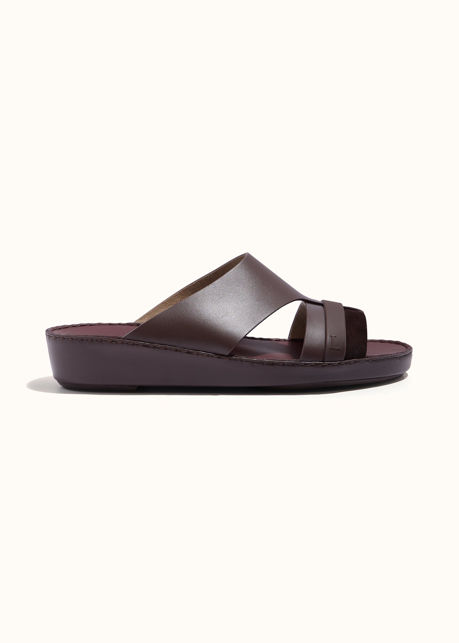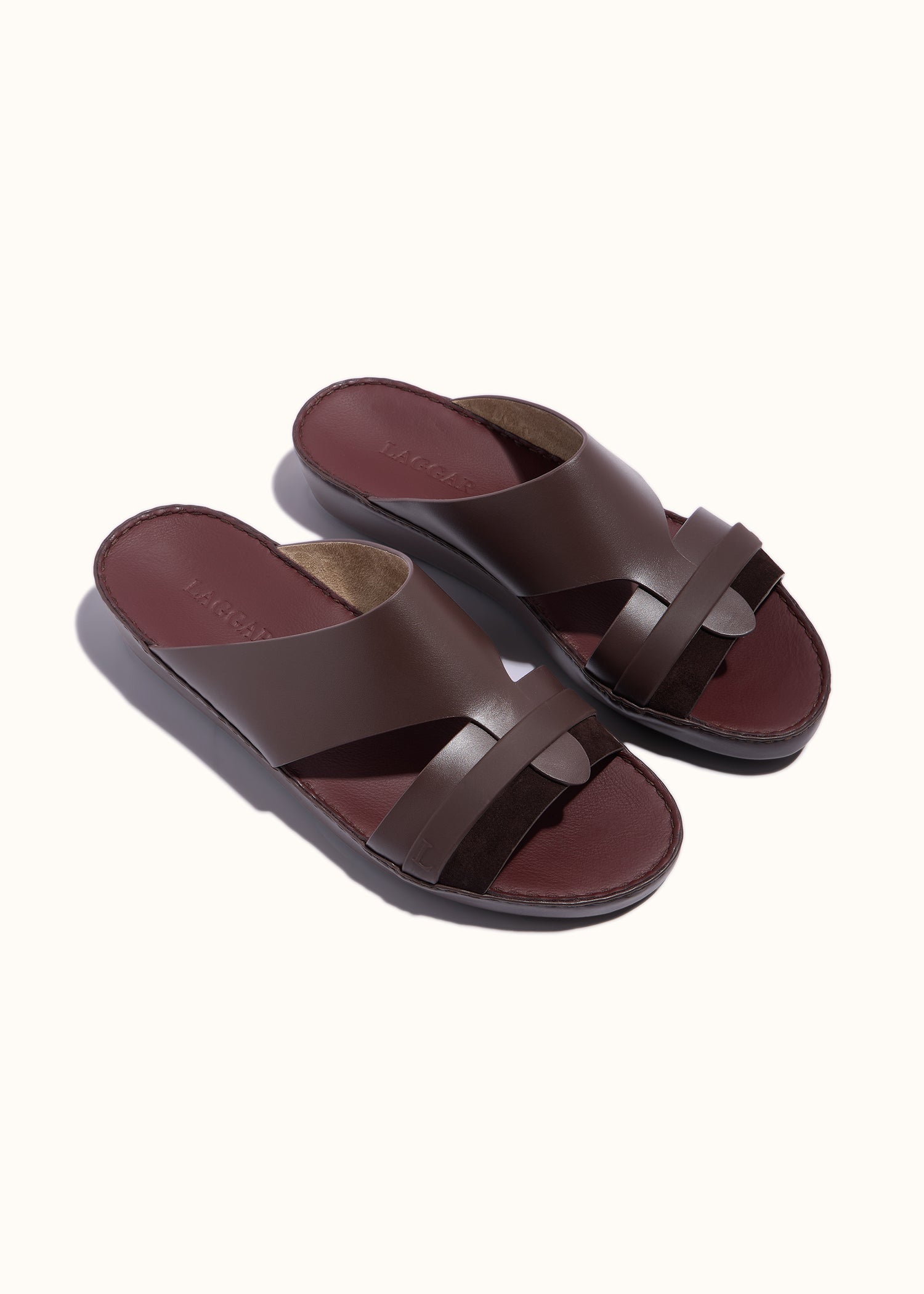 One of LAGGAR’s most renowned designs, the Rubber Grip Sandal is a bold expression of craftsmanship and innovation. The belt-cut silhouette is secured with a distinctive rubber grip, seamlessly blending PureCalf leather, Suede, and rubber for a striking mix of textures. Designed for both style and stability, this signature piece redefines contemporary footwear with its refined details and modern edge.